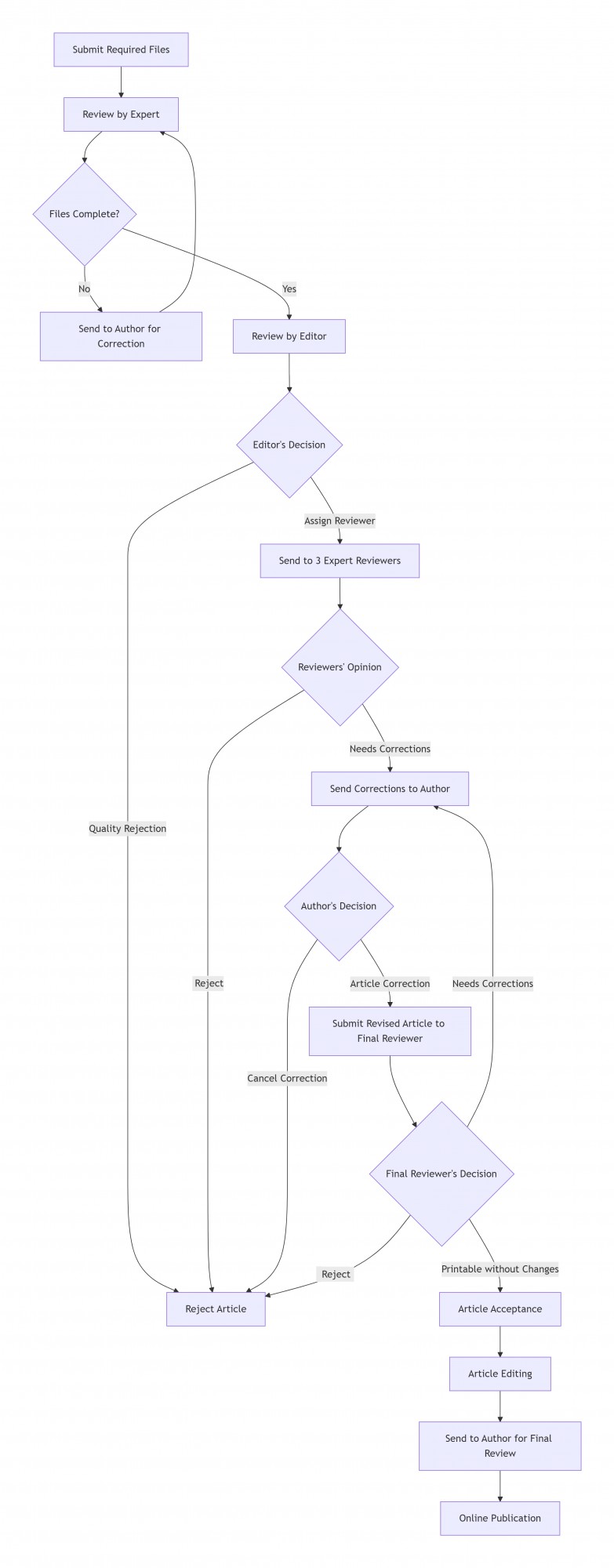 Once the manuscript is received and the submission process is completed, a code is assigned to the article. Authors are notified via email, and the article enters the initial review stage. During the initial review by the “Chief Executive” and “Chief Editor”, adhering to the format prescribed in the authors' guidelines can greatly impact the article's acceptance into the review stage. The initial review typically takes less than one week from the date of submission. If the submission guidelines have been adhered to and the manuscript meets the standards of scientific content, it will be forwarded to the reviewers. At this stage, the main file (with author’s name) is sent to two or three specialized reviewers simultaneously. The review period typically lasts about three to four weeks. Upon completion of the review, the possible outcomes for a manuscript are as follows: